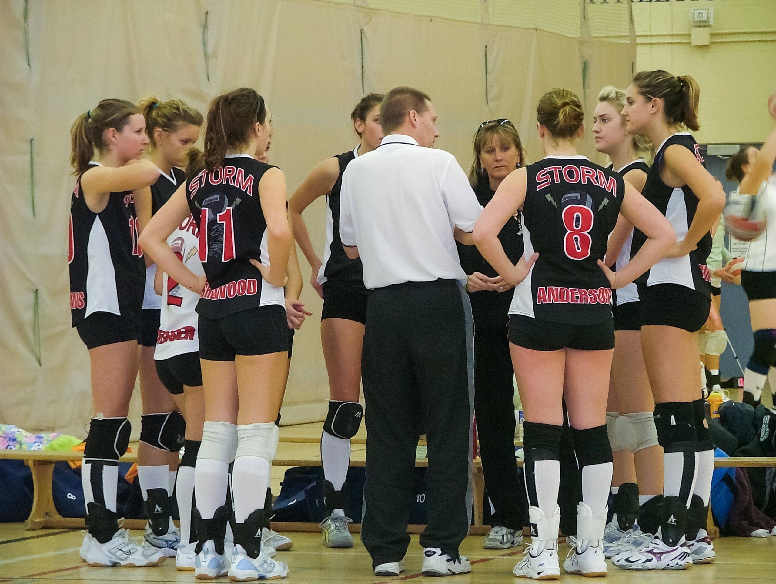 Colour photograph of Stafford with girls volleyball team in a gymnasium.
